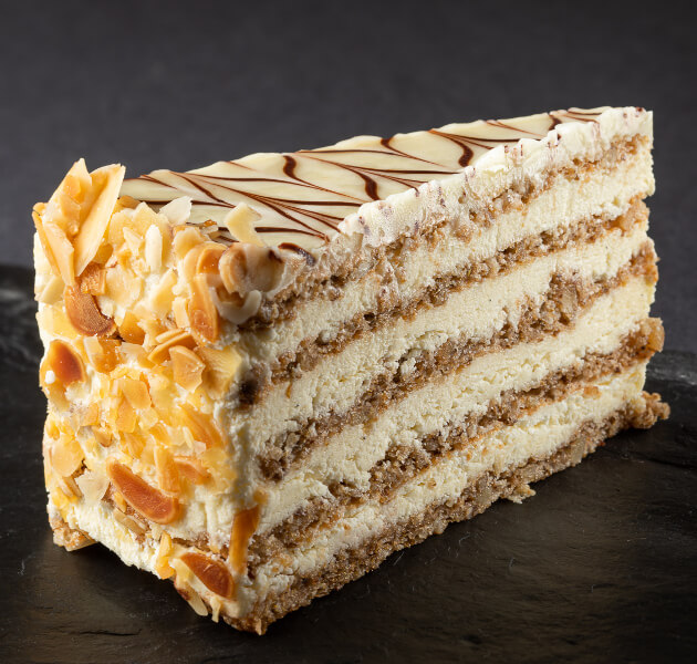Eszterhazy is one of the typical Hungarian cakes. Five light sponge cake layers baked with walnut, and filled with finest vanilla cream. We prepare it with decorated white chocolate layer on to to further improve tha harmony of tastes