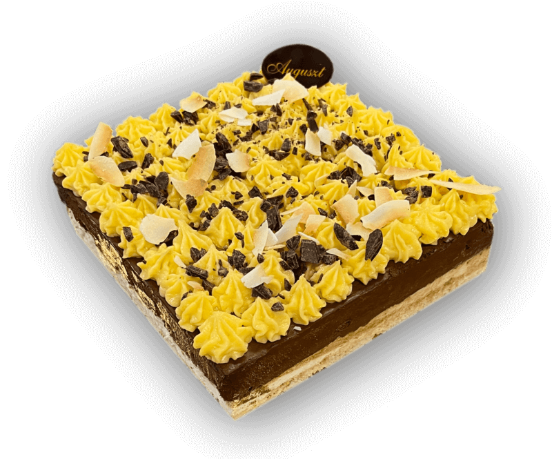 Kókuszos piskóta, kókusz püré, csokoládé mousse, lime-mal ízesített ananászos curd